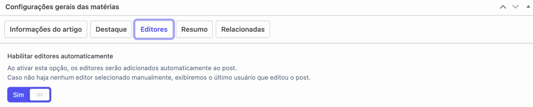 Nessa seção, você encontrará a opção “Habilitar editores automaticamente”. Ao ativá-la, o sistema incluirá automaticamente o nome do editor na notícia, mesmo que nenhum editor tenha sido selecionado manualmente. Nesse caso, será exibido o último usuário que editou o post.