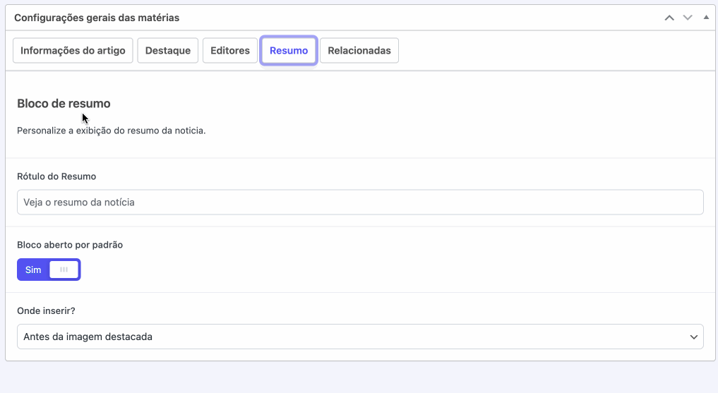 No menu principal do WordPress, acesse a aba “Publisher Center”, clique no subitem “Matéria” e selecione a aba “Resumo”. Você será direcionado para as configurações globais do bloco, onde poderá definir o comportamento padrão que será aplicado a todas as notícias que utilizarem o recurso.