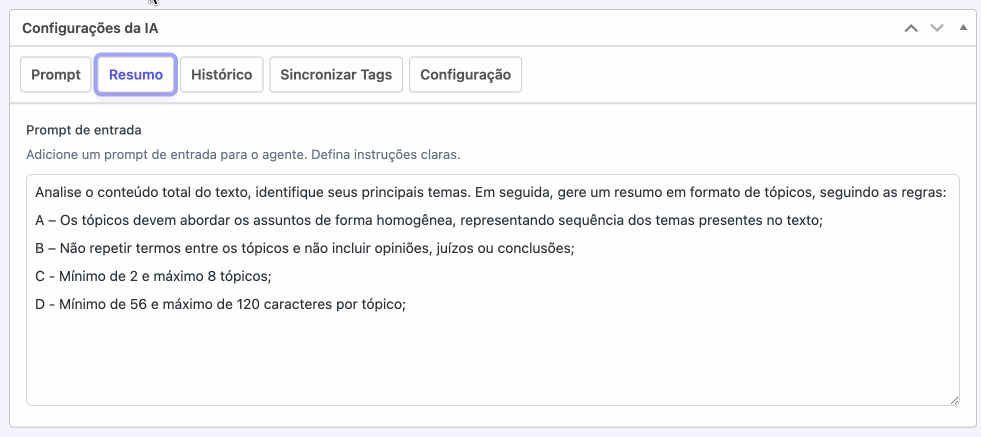 No menu principal do WordPress, acesse o item “Seox IA” e clique na aba “Resumo”. Nessa seção, você encontrará um campo para inserir o seu próprio prompt de resumo, caso o modelo padrão não esteja atendendo às necessidades editoriais do seu portal. Essa personalização permite ajustar o tom, a estrutura e o nível de detalhamento dos resumos gerados pela inteligência artificial.