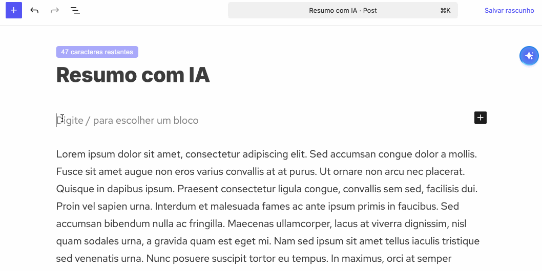 No editor Gutenberg, procure pelo bloco “Resumo”, insira-o na página e clique no botão “Gerar resumo com IA”. Um popup será exibido enquanto a IA processa o conteúdo e, em poucos segundos, o bloco será preenchido automaticamente com tópicos que sintetizam os principais pontos da notícia.