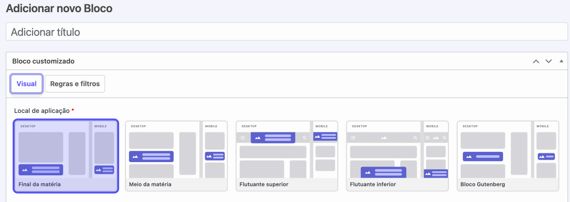 - Bloco Gutenberg: o conteúdo é inserido dentro de um bloco Gutenberg, permitindo que você o posicione exatamente onde desejar dentro da matéria. Para mais detalhes sobre essa configuração, consulte o tutorial Configurando o Bloco Customizado como Bloco do Gutenberg.