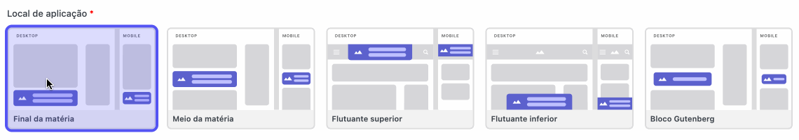 - Flutuante Inferior: O bloco ficará fixo no rodapé da tela, acompanhando o scroll. Essa opção exige atenção em portais que utilizam o formato de anúncio “Anchor”, pois pode haver sobreposição de elementos, prejudicando a experiência do usuário e a performance da campanha.