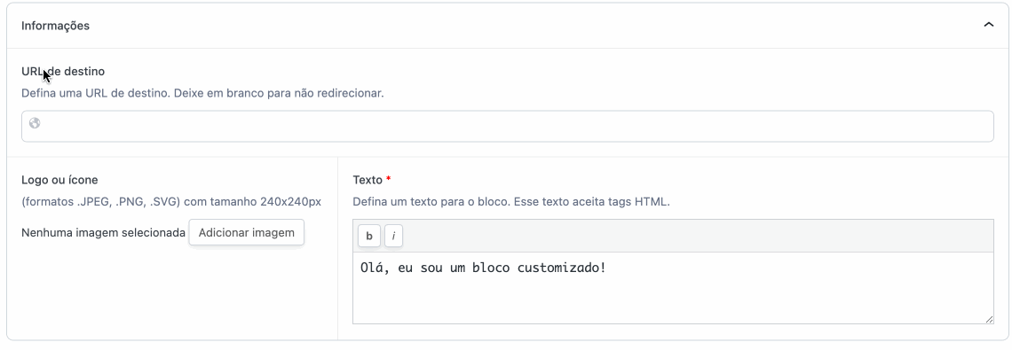 Nesta etapa, você irá configurar o conteúdo do bloco customizado preenchendo os seguintes campos: