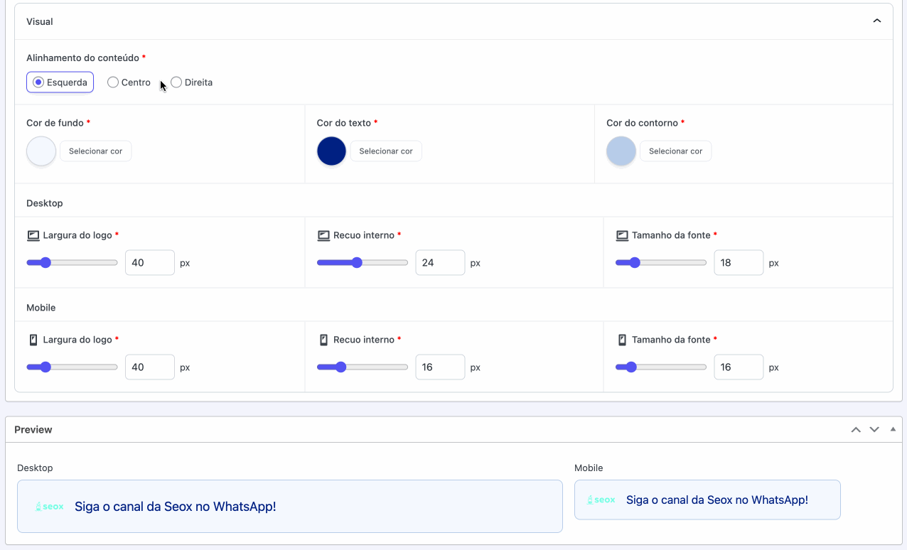 À medida que você preenche essas informações, poderá acompanhar em tempo real a pré-visualização do bloco nas versões desktop e mobile, acessando a seção “Preview”. Isso facilita ajustes de layout e garante que o bloco fique visualmente alinhado à proposta da campanha.