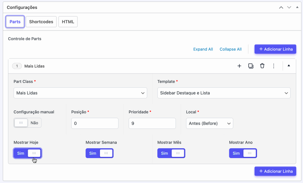Configuração Manual (Avançada): Se você deseja ter controle preciso sobre a inserção, ative o switch “Configuração Manual”. Em seguida, insira o hook específico desejado no campo “Nome do Hook”. Para um entendimento completo sobre a utilização de hooks, consulte o tutorial relacionado.