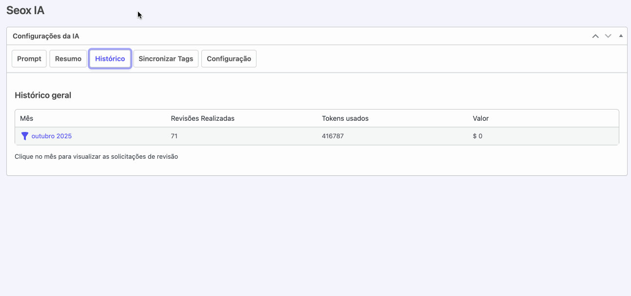 Essa funcionalidade possui um custo por uso, cobrado a cada requisição feita à IA. Todo o histórico de uso e os valores correspondentes podem ser acompanhados de forma transparente na aba “Seox IA”, dentro da seção “Histórico”.