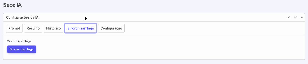 Sempre que uma nova tag for criada, excluída ou mesclada no portal, é importante manter o banco de dados da inteligência artificial atualizado. Para isso, acesse a aba “Sincronizar Tags” dentro da seção “Seox IA” e clique no botão “Sincronizar Tags”. Essa ação garante que a IA reconheça todas as tags atuais do portal, possibilitando uma associação correta entre palavras-chave e links internos nas próximas notícias otimizadas. Essa sincronização é essencial para manter a eficiência e a precisão do processo de otimização.