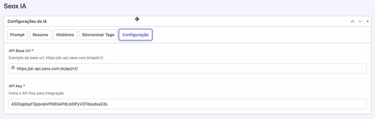 A aba de configurações é destinada aos parâmetros técnicos da integração com a IA. Nela estão definidos a URL da API base e o código da chave de API utilizados para a conexão com o Gemini. Por se tratar de uma área sensível, recomendamos que nenhuma alteração seja feita sem a validação prévia da equipe da Seox. Isso evita falhas na comunicação entre o portal e a inteligência artificial.