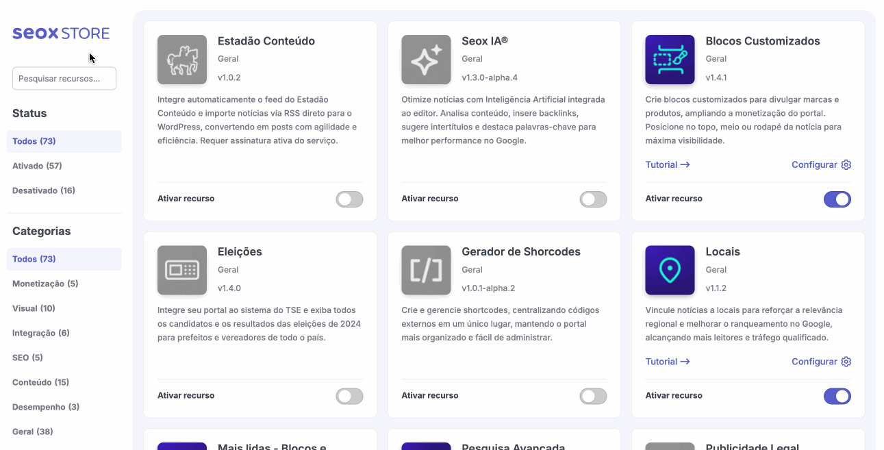 Acesse o menu “Seox Store” e ative o card “Seox IA”.