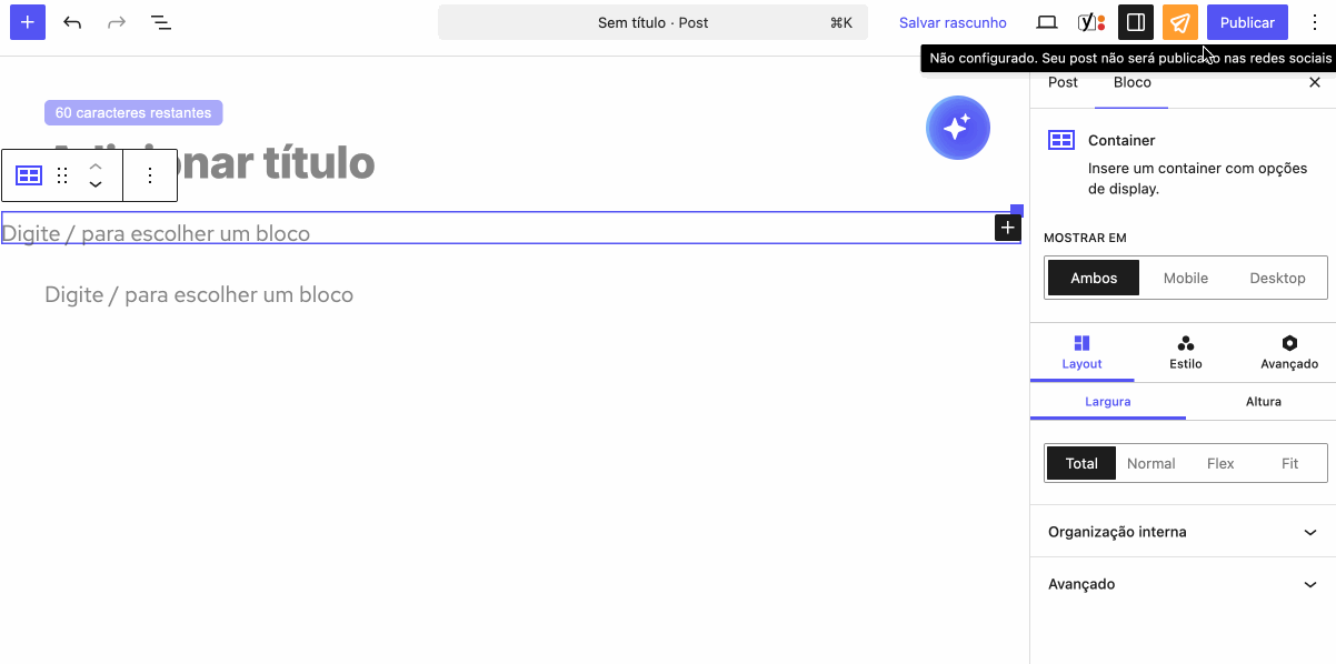 Para agilizar o processo, você também pode utilizar o atalho digitando /container diretamente dentro do conteúdo da notícia. Isso abrirá o bloco de forma rápida, sem a necessidade de navegar pelo menu lateral.