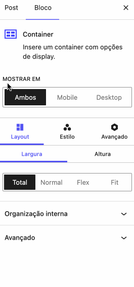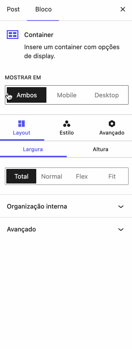 O novo bloco Container permite que você controle com precisão em quais dispositivos o conteúdo será exibido: desktop, mobile ou ambos. Para configurar essa exibição, selecione o bloco no editor Gutenberg e, na barra lateral direita do WordPress, localize a seção “Mostrar em”. Ali, você encontrará um switch com três opções: Ambos, Mobile ou Desktop. Basta escolher aquela que faz mais sentido para o layout da sua página.