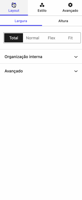 Na aba Layout das configurações do bloco, você encontrará as opções de largura e altura. Dentro da opção largura, é possível escolher entre quatro modos diferentes, de acordo com a necessidade visual e estrutural da sua página: