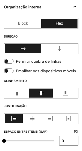 Esse recurso permite estruturar os conteúdos sem depender do bloco tradicional de colunas, garantindo mais leveza e performance. Você poderá controlar o alinhamento horizontal e vertical, o espaçamento entre os elementos, a direção dos itens, entre outras configurações.