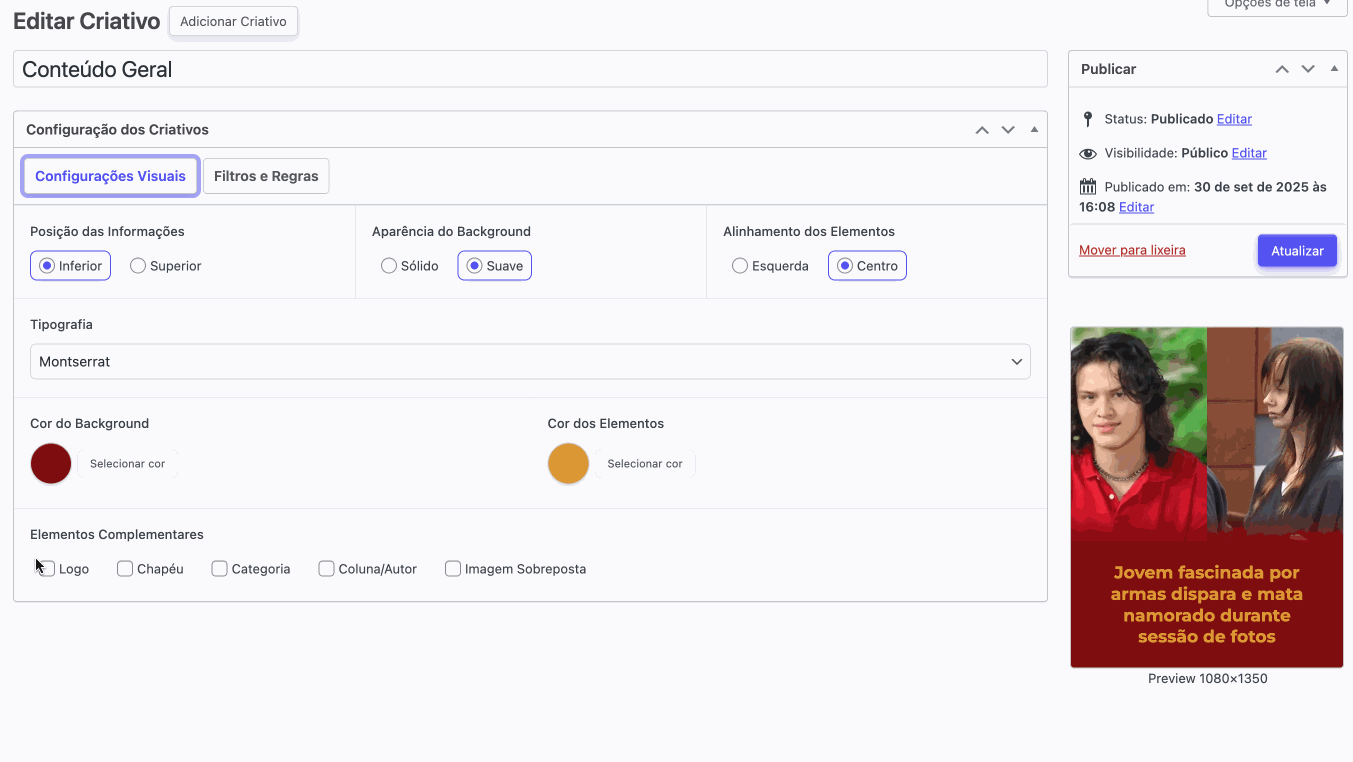 - Cor de background: defina a cor de fundo do criativo, ajustando-a conforme a identidade visual do portal ou a categoria da notícia.