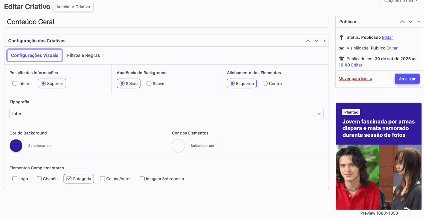Após concluir todas as configurações, clique no botão “Publicar” para salvar o criativo. A partir desse momento, sempre que uma notícia for publicada e suas categorias ou colunas corresponderem às regras definidas no criativo, o Seox Poster utilizará automaticamente a imagem personalizada configurada para aquela seção.