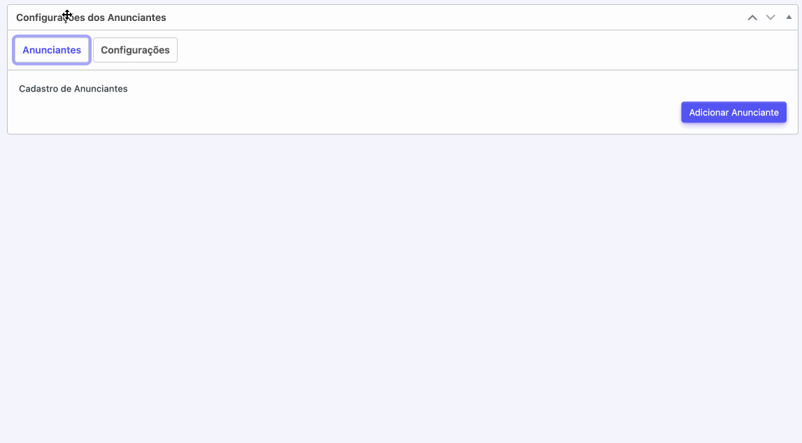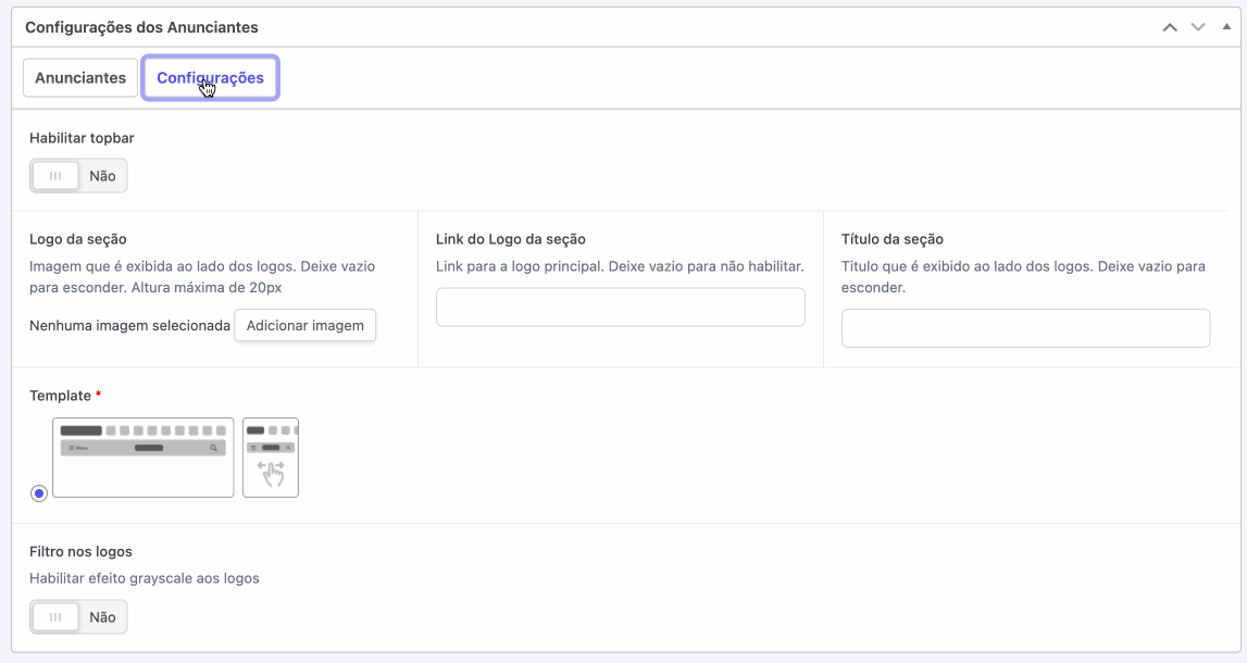 Na aba “Anunciantes”, clique no botão “Adicionar Anunciante”. Um novo slot será exibido para que você insira o logo da marca parceira, o nome do anunciante e a URL que será aplicada sobre o logo para o redirecionamento do clique. Repita o processo para adicionar quantos parceiros desejar.