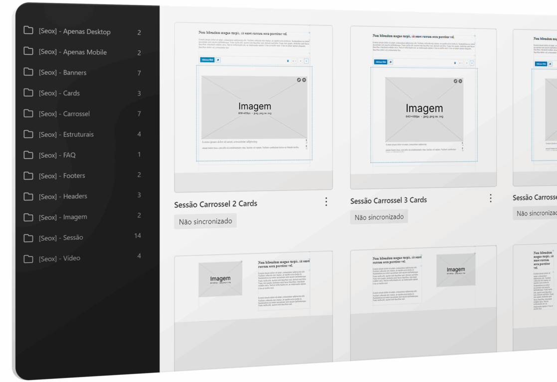 ensando em otimizar o fluxo de trabalho para diferentes necessidades, a Seox organizou esses blocos em uma biblioteca prática, separada por categorias de uso comum. A biblioteca inclui elementos essenciais como banners, cabeçalhos, carrosséis de testemunhos, módulos de vídeo e diversas outras seções estruturais. Essa classificação cuidadosa permite que o criador de conteúdo localize e insira o componente em instantes, reduzindo o tempo de implementação e mantendo o foco na estratégia e conversão da página.