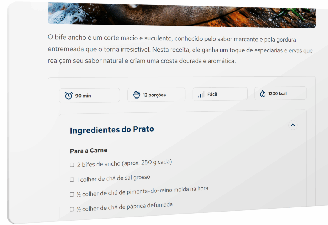 O recurso também oferece uma experiência totalmente interativa para o usuário: cada ingrediente pode ser marcado com um checkbox, ajudando o leitor a acompanhar a lista durante o preparo e deixando o processo muito mais prático. O resultado é um conteúdo mais organizado, fácil de seguir, com maior potencial de ranqueamento e capaz de oferecer uma experiência muito melhor ao público.