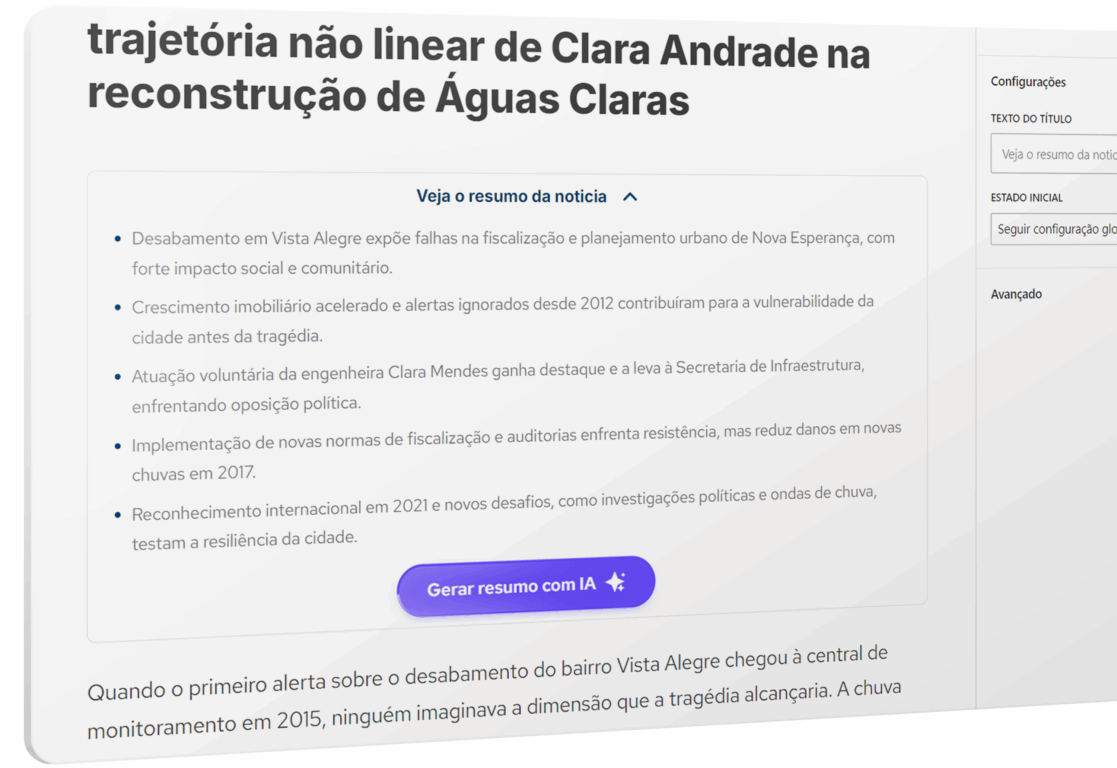 O novo bloco de resumo com IA foi criado para simplificar uma das tarefas mais importantes dentro de uma redação: transformar uma matéria completa em um resumo curto, direto e otimizado para SEO. Agora, essa etapa pode ser realizada em segundos.